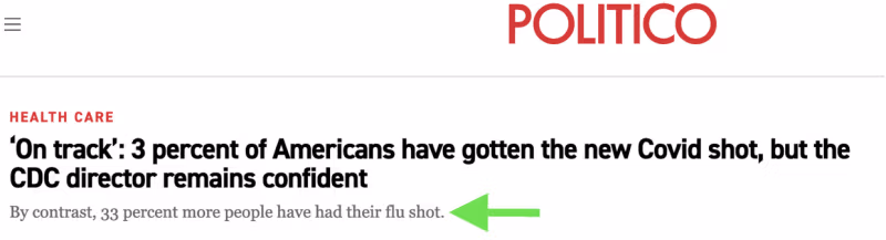 Согласно статье Politico от 24 октября — почти через два месяца после того, как были разрешены обновленные бустеры Covid-2023 19 года — только 3.6 процента американцев получили обновленную прививку.