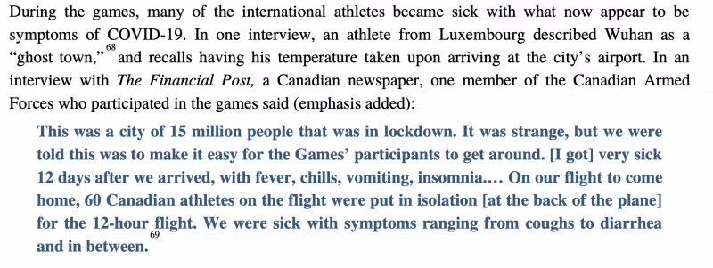 Когда в начале 19 года во всем мире разразилась пандемия covid-2020, спортсменов из нескольких стран, в том числе Франция, Германия, Италия и Люксембург — публично заявили, что они заразились тем, что, по их мнению, было Covid-19 на играх в Ухане, основываясь на своих симптомах и том, как их болезни распространились на их близких. В Вашингтоне военачальники либо отбросил идею с рук или не знали об этом. Между тем, никто не проводил тестирования на антитела или отслеживание заболеваний у этих тысяч спортсменов. Никто даже не пытался выяснить, действительно ли игры в Ухане были первым международным мероприятием по суперраспространению пандемии.
