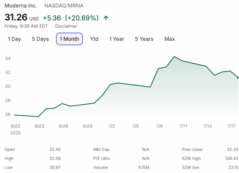 Меня много раз просили разъяснить, что произошло с недавним общим (не требующим разрешения ЕС) регистрационным разрешением FDA на вакцину SpikeVax для детей от Moderna, выданным 10 июля 2025 года. По правде говоря, я не знаю, что именно произошло в FDA и привело к такому результату. Как и многие, я был шокирован и разочарован. Moderna была вне себя от радости. Стоимость их акций и рыночная капитализация резко возросли, причём рост начался за четыре дня до объявления, что говорит о наличии у кого-то инсайдерской информации. Если это правда, то, вероятно, это инсайдерская торговля. Именно такого нарушения правил многие ожидают от этой компании и отрасли. В рамках данного обсуждения можете считать это гипотезой.