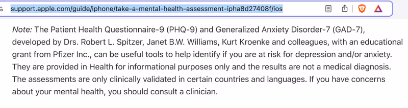 Так в чем же выгода Apple? В настоящее время Apple, по-видимому, продает рекламу различных услуг в области психического здоровья, «подключая» услуги к телефонам людей. Apple пишет, что «Эти оценки могут помочь пользователям определить свой уровень риска, подключиться к ресурсам, доступным в их регионе, и создать PDF-файл для передачи своему врачу».